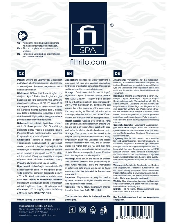 Magnézium z Mrtvého moře mineralizuje vodu a vytváří léčebnou a ekologickou vodu v bazénu nebo vířivce. Je vhodný pro lidi s poruchou pokožky jako jsou lupénka, Atopický ekzém a další nemoci. Je prokázáno, že plavci mohou vstřebat až 500 ml vody za jednu hodinu. Hořčík rozpuštěný ve vodě, tak jednoduchou cestou vstřebáte a načerpáte přírodní zdroj energie a léčbu pokožky, vlasů, nervového systému. Magnézium se vstřebává do pokožky a je nutné jeho doplňování a to každých 6 měsíců cca 10Kg pytel na 20m3, který bude udržovat hladinu magnézia ve vašem bazénu.