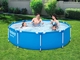 Bazén Bestway (vodní kapacita 4678 litrů) je samonosný rodinný bazén. Nadzemní bazén pro povrchovou montáž je vyroben z trojvrstvého PVC. Díky své kovové konstrukci je velmi pevný a stabilní. Upoutá svou jednoduchou montáží. Dlouhá životnost.