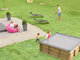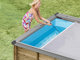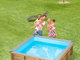 Dřevěný bazének Pistoche o vnějším rozměru 2,26 × 2,26 × 0,68m je vhodný pro malé děti díky variabilitě hloubky vody.