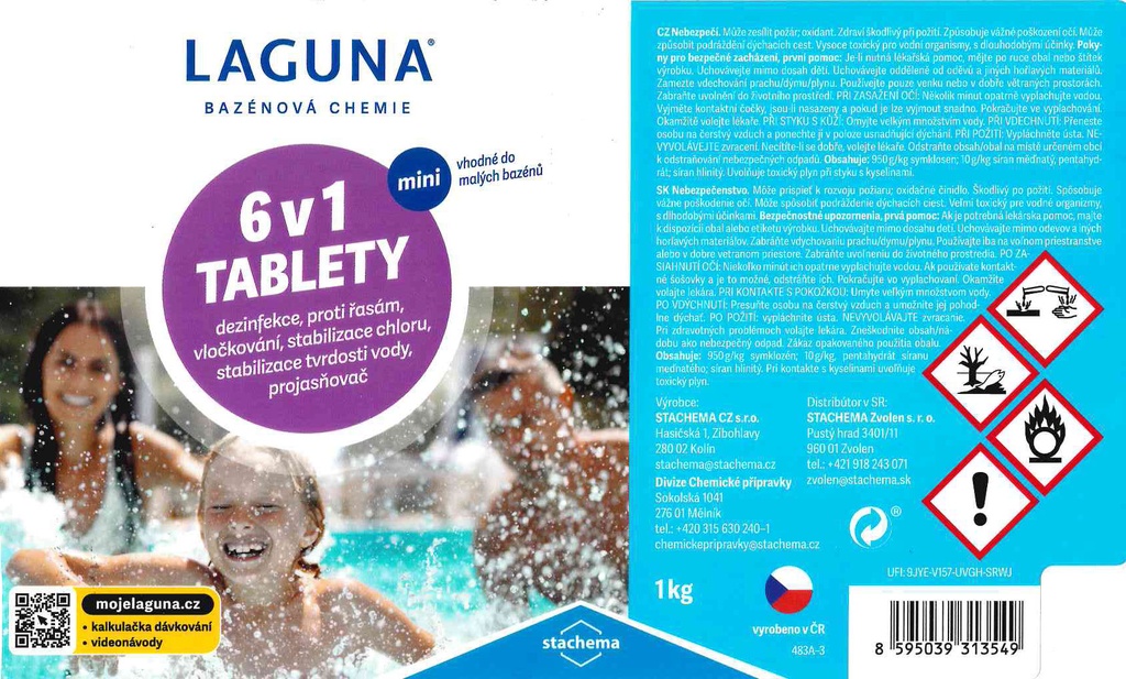 Laguna 6v1 tablety je moderní víceúčelový přípravek pro celosezónní průběžnou údržbu vody ve všech typech bazénů. Slouží jako dezinfekční přípravek, současně umožňuje vyvločkování nečistot, likviduje řasy a zabraňuje jejich růstu, stabilizuje chlor ve vodě, projasňuje-zlepšuje zachycení nečistot ve filtraci a stabilizuje tvrdost vody.