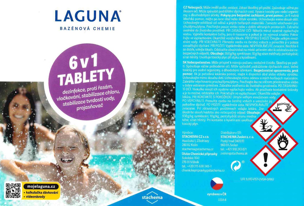 Laguna 6v1 tablety je moderní víceúčelový přípravek pro celosezónní průběžnou údržbu vody ve všech typech bazénů. Slouží jako dezinfekční přípravek, současně umožňuje vyvločkování nečistot, likviduje řasy a zabraňuje jejich růstu, stabilizuje chlor ve vodě, projasňuje-zlepšuje zachycení nečistot ve filtraci a stabilizuje tvrdost vody.