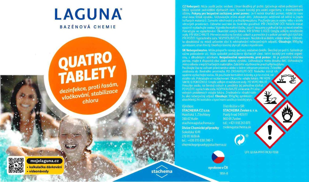 Laguna Quatro tablety slouží jako dezinfekční přípravek pro celosezónní průběžnou údržbu vody ve všech typech bazénů. Současně umožňuje vyvločkování nečistot, působí jako stabilizátor aktivního chloru, likviduje řasy a zabraňuje jejich růstu. Obsah 50ks tablet po 200g.