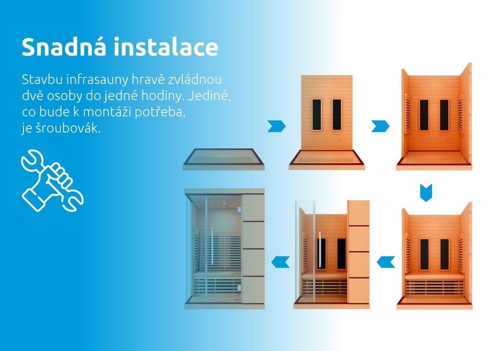 Tato sauna v sobě kombinuje jak finskou saunu, tak i infrasaunu. Pokud nemáte rádi v sauně tak vysokou teplotu, oceníte možnost zapnutí pouze infračervených zářičů. V sauně je 8 karbonových topidel. Kamna finské sauny pracují na základě termoterapie – léčebné metody, která využívá příznivé účinky mírného přehřátí tkání. Současné zapnutí saunových kamen a zářičů možné není.