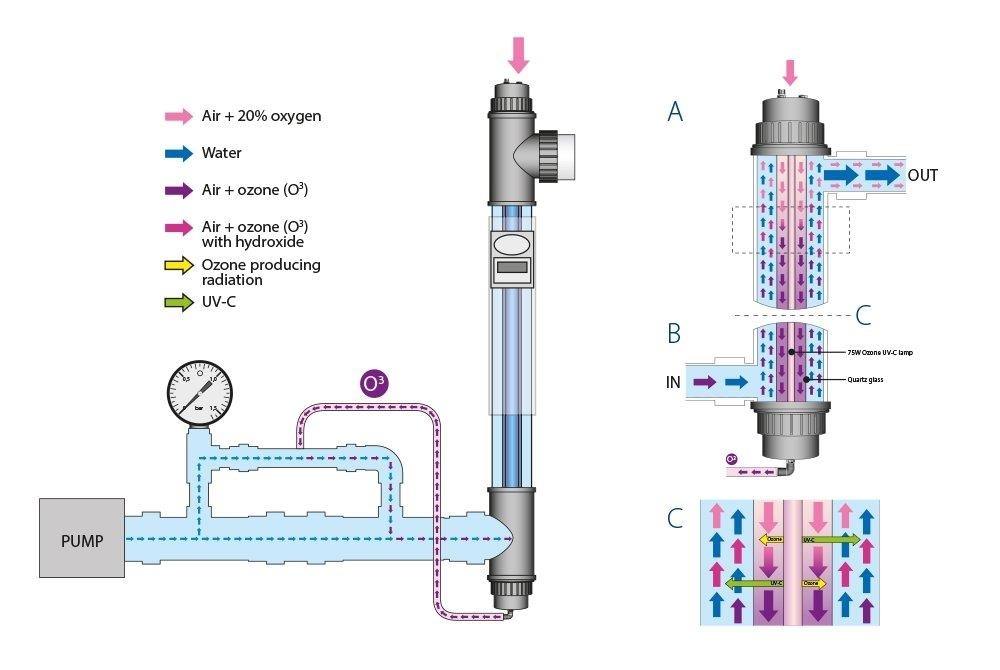 Speciální UV-C lampa generuje záření jak 254nm, tak 185nm. 185nm záření přeměňuje dostupný kyslík na ozón. Produkovaný ozón (max. 0,6 g/h) se promísí s vodou (přes Venturiho trubici), aby došlo k dezinfekci/oxidaci. Uvnitř UV-C pouzdra je veškerý zbytkový ozón přeměněn 254nm UV-C zářením na OH- radikály (tzv. Advanced Oxidation Process), které mají ještě silnější oxidační sílu než ozón.