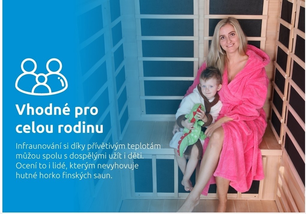 Zdraví Pravidelné používání infrasaun pozitivně ovlivňuje lidské zdraví. Saunování snižuje bolest, omezuje ztuhlost kloubů, zvyšuje prokrvení a působí protizánětlivě. V neposlední řadě navozuje psychickou pohodu, snižuje svalový spasmus a posiluje kardiovasklulární kondici. Infrasaunu je možné používat i v případech, kde zdravotní stav nedovoluje použití klasické sauny. Samotné saunování navozuje příjemný pocit pohody, uvolnění a relaxace. Infrasauny jsou natolik bezpečné, že se jejich technologie používá i v dětských inkubátorech.