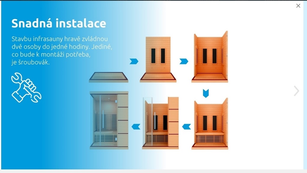 Montáž Montáž infrasauny je rychlá a jednoduchá. K přichycení jednotlivých částí se používají kufrové spony, čepy nebo klasické šrouby. Elektroinstalace je již namontovaná od výrobce, pouze stačí propojit kabeláž pomocí zásuvek a konektorů. Vše je přehledně označené.