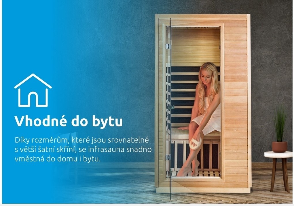 Umístění infrasauny Infrasauna je určena k používání v interiéru. Měla by být postavena ve vnitřních prostorách, ve kterých teplota neklesá pod 15 °C. Ideálně například v ložnici, koupelně, domácím fitness, v suterénu, či technické místnosti. Jako vhodný podklad slouží jakýkoliv rovný povrch. Mohou to být dlaždice, lino, koberec, nebo například parkety. Infrasauna není konstruována pro umístění do zahradního domku, pergoly ani chladného sklepa.