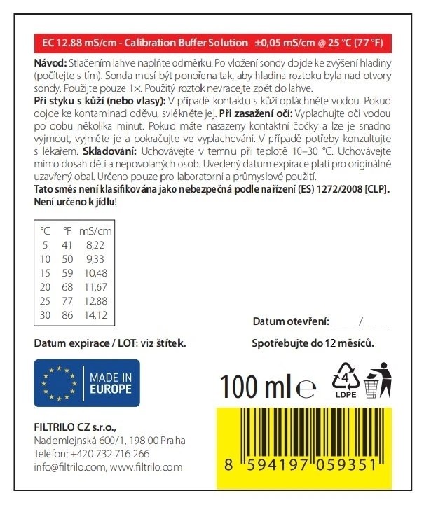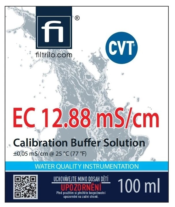 Kalibrační roztok EC 12,88 mS/cm je určen pro kalibraci a ověřování vodivostních (EC) sond, EC přístrojů (konduktometrů) a EC senzorů, a to jak v laboratorní praxi, tak v provozních a průmyslových aplikacích. Jedná se o certifikovaný kalibrační roztok s metrologickou sledovatelností, určený ke kalibraci a ověřování senzorů v průmyslových aplikacích.