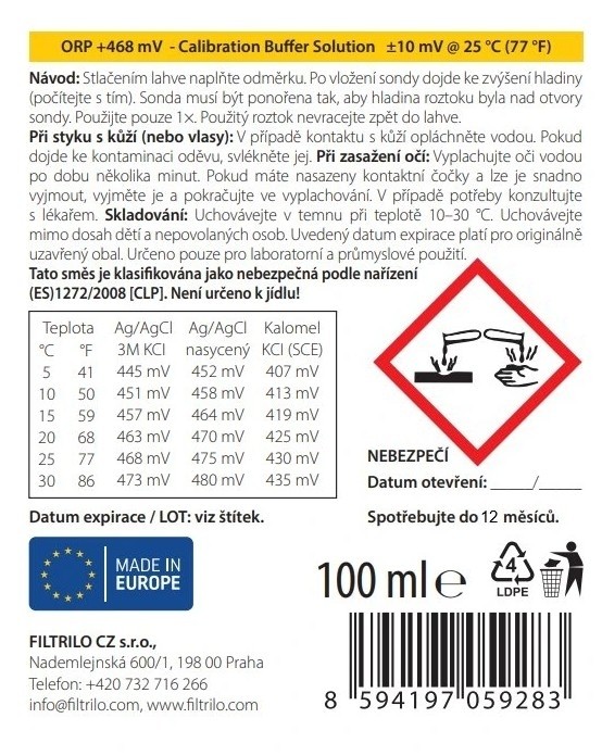 Kalibrační roztok ORP +468 mV je určen pro kalibraci a ověřování ORP (RedOx) elektrod, ORP přístrojů (ORP metrů) a ORP senzorů, a to jak v laboratorní praxi, tak v provozních a průmyslových aplikacích. Jedná se o certifikovaný kalibrační roztok s metrologickou sledovatelností, určený ke kalibraci a ověřování senzorů v průmyslových aplikacích.