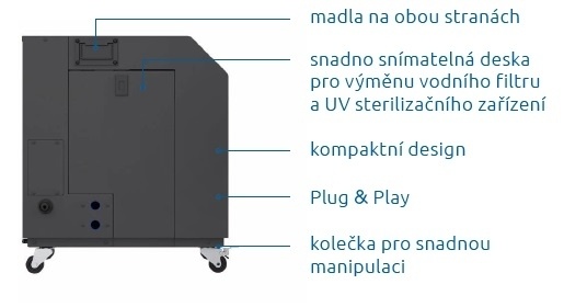 Uvnitř zařízení se nachází Cirkulační čerpadlo se samonasávacím systémem, vodní filtr, UV sterilizátor a kartušoví filtrace.