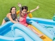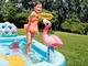 Součástí balení vodní skluzavka, nafukovací palma, plameňák, opice, kroužky na hraní a 5 balónků