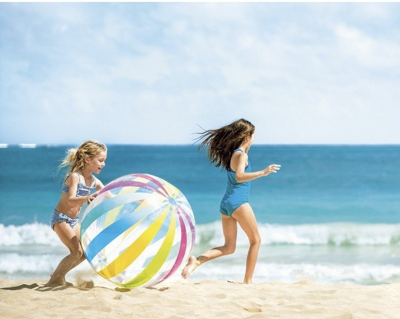 Velký nafukovací míč do vody ve veselých barvách, velikost 107 cm (polovina obvodu míče), tloušťka materiálu 0,23 mm.