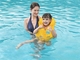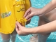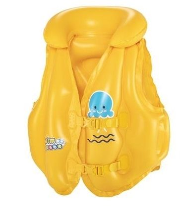 Vesta napomáhá udržet se na vodě při prvních pokusech naučit se plavat.