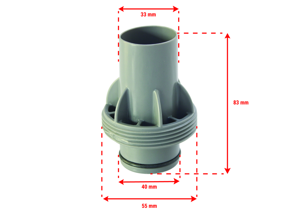 Adaptér se nasazuje na vývod z bazénu o průměru 32mm a z druhé strany se připojuje hadice se šroubením 38mm.