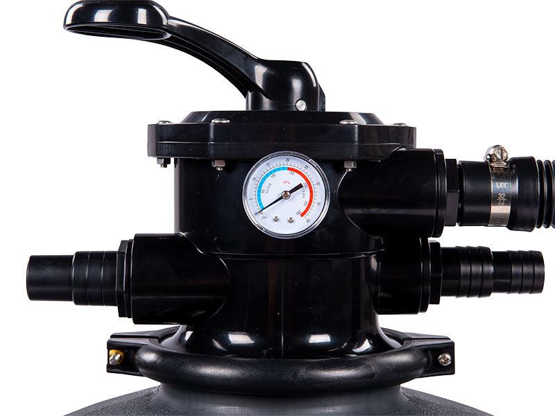 Písková filtrace se sestává z filtrační nádoby se 6 cestným ventilem s manometrem, propojovací hadice a samonasávacím čerpadlem s velkým předfiltrem.