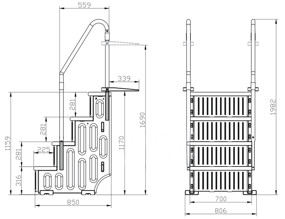 Vhodné pro bazény s výškou boční stěny od 120 do 145 cm. Celková