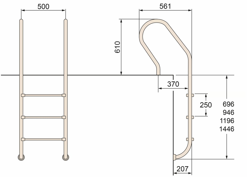 Žebříky jsou určeny pro privátní a komerční bazény. Jsou vyrobeny z leštěné nerez oceli. AISI 316 průměru 43 mm. Stupně jsou doplněny protiskluz. nášlapy. Kotvení se dodává s pouzdrem a svorkou pro uzemnění.