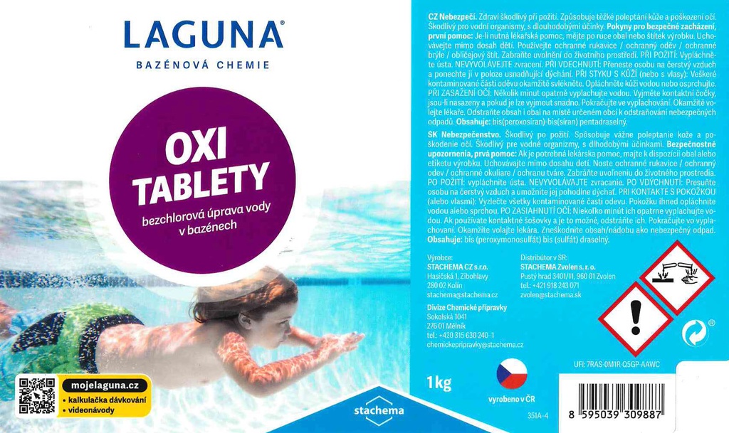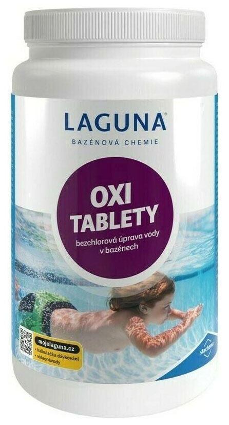 Po té vodu ošetřete použitím tablet OXI. Počáteční šoková dávka 2ks tablety na 20m3 bazénové vody. Průběžné dávkování 1ks tablety na 20m3 bazénové vody. Při vyšší teplotě bazénové vody kontrolujte naměřené hodnoty až 3×týdně. Při teplotě nad 23°C doporučujeme pro zachování čisté vody přidávat přípravek proti řasám Laguna ALG blue. Tablety dávkujte sběračem (skimmerem), plovákem nebo jiným dávkovačem při zapnutém filtračním zařízení. POZOR-nikdy nevhazujete tablety přímo do bazénu!! Přímí kontakt tablety s folií může způsobit její vybělení.