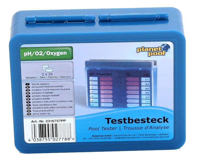 Kompletní set bezchlorové chemie, testeru a plováku na ošetření bazénové vody. Pro dosažení křišťálově čisté a trvale hygienicky nazávadné vody je bezpodmínečně nutné udržovat obsah volného kyslíku v rozmezí 8–15g/l a pH v rozmezí 6,8–7,6. Obsah kyslíku v bazénové vodě a hodnota pH se průběžně kontrolují testery nejméně 1–2× týdně.