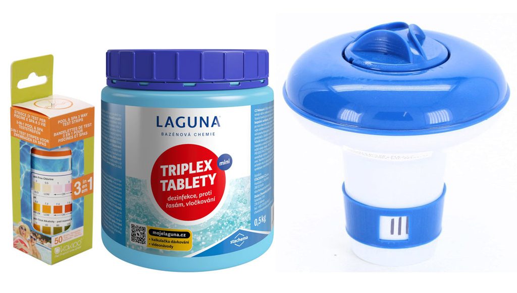 Set bazénové chemie na chlorovou úpravu pro malé bazénky do 10m3. Obsahuje MINI Triplex tablety 20g 0,5kg, tester vody, plovák malý.