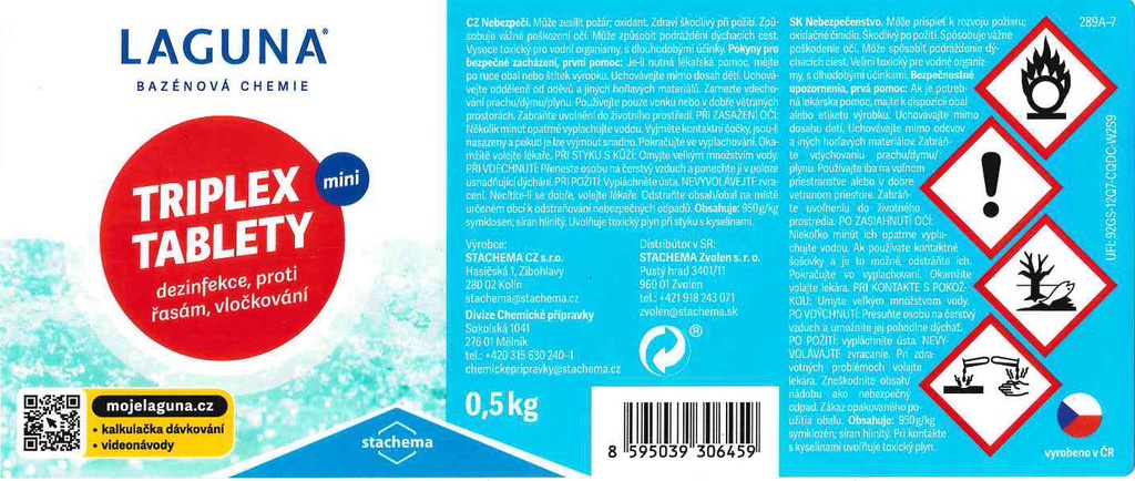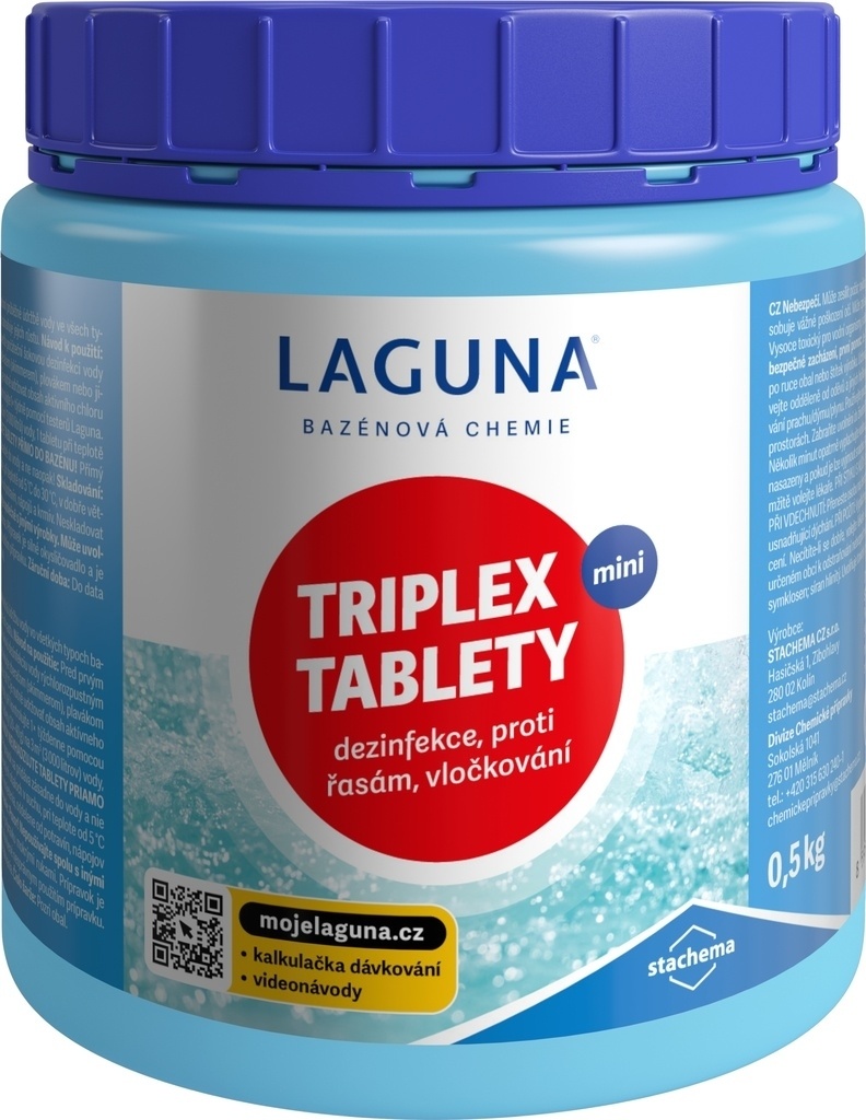 Pro dosažení křišťálově čisté a trvale hygienicky nazávadné vody je bezpodmínečně nutné udržovat obsah aktivního chloru v rozmezí 0,3 – 0,8 mg / l a pH v rozmezí 7,2 – 7,6. Obsah chloru v bazénové vodě a hodnota pH se průběžně kontrolují testery nejméně 1 x týdně. K upravení hodnoty pH použijte přípravků pH+ a pH-. Poté použijte k ošetření bazénové vody přípravek MINI Triplex tablety. Po aplikaci přípravku MINI Triplex tablety dochází k postupnému uvolňování chloru (desinfekci a oxidaci organického znečištění vody) a zároveň k rozpouštění látky s algicidním účinkem (prevence a likvidace řas) a vločkovače (odstraňuje případné zakalení vody vyvločkováním nečistot). Dle teploty vody přidávejte každých 6 – 8 dnů 1 – 2 tablety (20 – 40 g) na 3 m3 (3 000 litrů) vody, 1 tabletu při teplotě do 25 °C, 2 tablety nad 25 °C. NIKDY NEHÁZEJTE TABLETY PŘÍMO DO BAZÉNU! (přímý kontakt tablety s fólií může způsobit její vybělení). Tablety se dávkují přes skimmer, nebo plovákem.