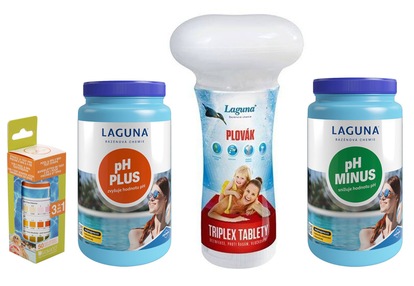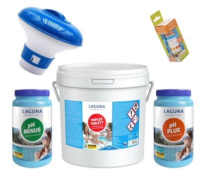 Set základní bazénové chemie na chlorovou úpravu bazénové vody. Obsahuje Triplex tablety 200g 5kg , pH- 1,5kg, pH+ 0,9kg, tester vody, plovák velký