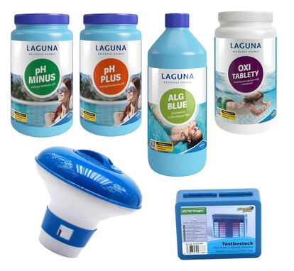 Set základní bazénové chemie na bezchlorovou úpravu bazénové vody. Obsahuje OXI tablety 200g/1tableta - 1kg, pH- 1,5kg, pH+ 0,9kg, Algicid ALG Blue 1l, tester na pH a O2, plovák na tablety.