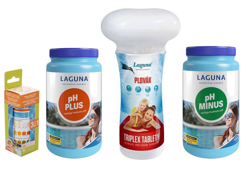 Set bazénové chemie na chlorovou úpravu pro malé bazény do 68m3. Obsahuje Triplex tablety PLOVÁK 1400g, tester vody, pH plus a pH minus.