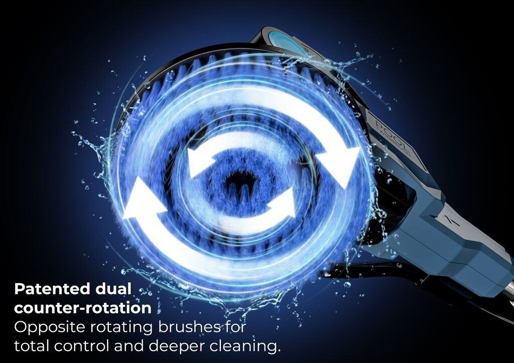 - Dvojité rotační kartáče (2v1) – efektivní čištění díky protiběžnému otáčení