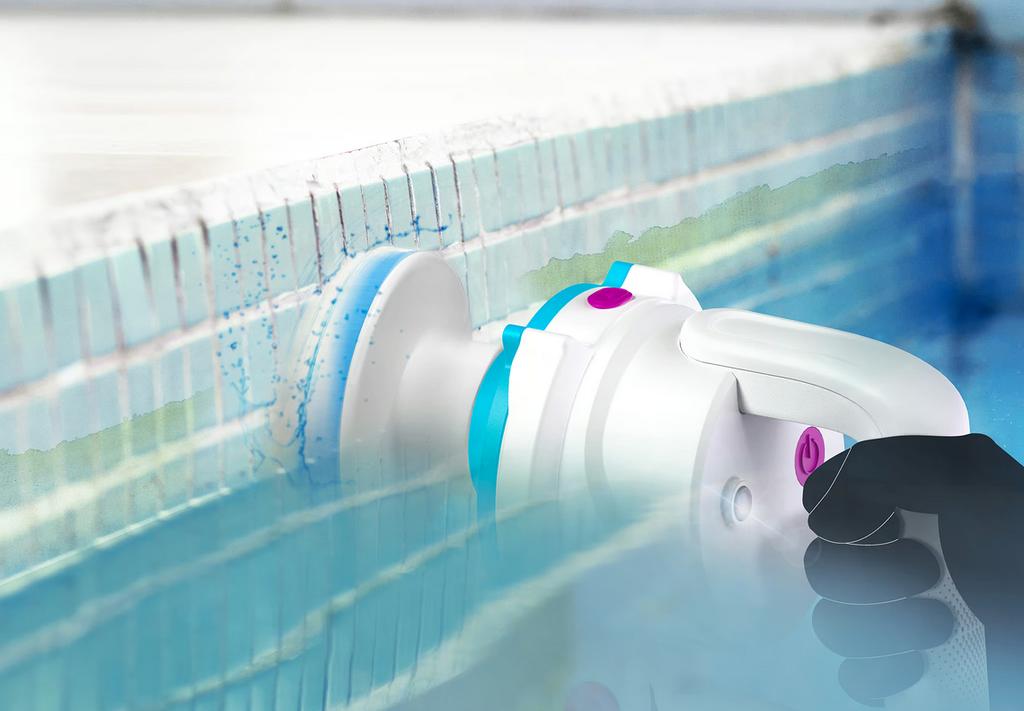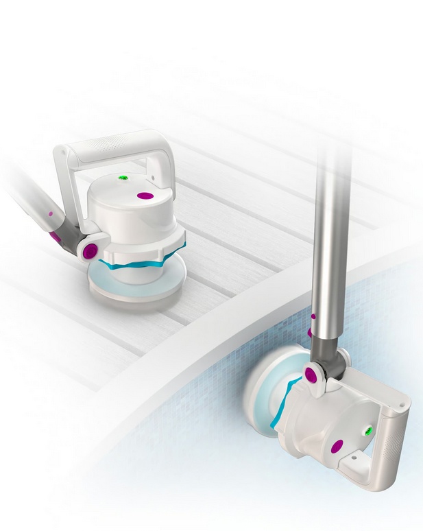Akumulátorový rotační kartáč pro čištění bazénu, stěn a hladinové linky. Bezdrátový provoz a kloub 180° pro snadný přístup i do hůře dostupných míst.