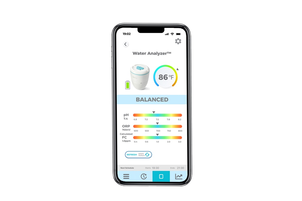 Automaticky monitoruje kvalitu vody v bazénu a odesílá data prostřednictvím aplikace INTEX Link®. Při potřebě úpravy chemické rovnováhy vody pošle upozornění a podrobné pokyny k akci.