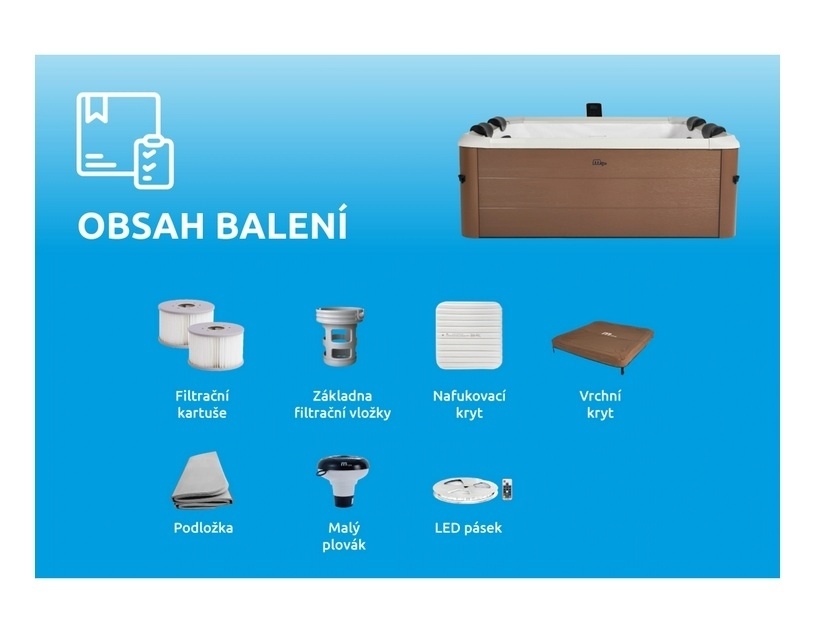 Je vybavena 140 vzduchovými a 8 nastavitelnými hydromasážními tryskami a samozřejmě i účinným ohřevem vody. Obsahuje také vrchní kryt, který pomůže udržet teplotu vody stále vysoko. Bezpečnostní klipsny zajistí, že zůstane bezpečně uzavřená.
