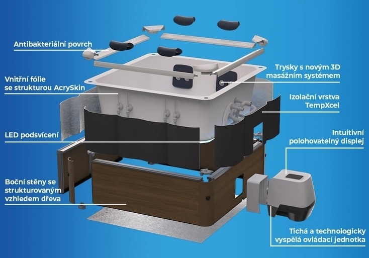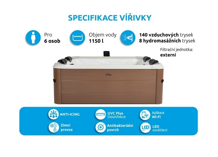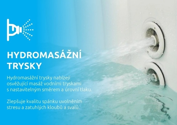 - Trysky: 140 vzduchových + 8 nastavitelných hydromasážních trysek