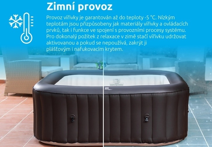 Provoz vířivky je garantován až do teploty –5 °C. Nízkým teplotám jsou přizpůsobeny jak materiály vířivky a ovládacích prvků, tak i funkce ve spojení s provozními procesy systému. Pro dokonalý požitek z relaxace v zimě stačí vířivku udržovat aktivovanou a pokud se nepoužívá, zakrýt ji plášťovým i nafukovacím krytem. Při poklesu venkovní teploty pod 4 °C je před nafouknutím potřeba nechat plášť vířivky aklimatizovat v teplé místnosti po dobu 24 hodin. Po vynesení vířivky ven, je nutné ji ihned nafouknout, napustit vodou a zapnout ohřev. Ve velkém mrazu nedoporučujeme dlouhodobé používání vířivky venku.