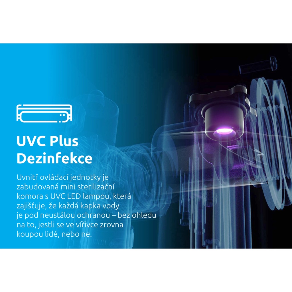 Model je dodáván s jednou ze dvou variant automatické dezinfekce vody (UVC záření nebo ozonátor) dle aktuální skladové dostupnosti. Obě technologie poskytují srovnatelný výkon a zajišťují křišťálově čistou vodu bez nadbytečné chemie.