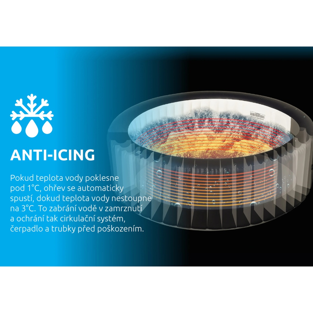 Systém ANTI-ICING bude neustále dohlížet na vaši vířivou vanu a hlídat bezpečnou úroveň teploty. Pokud teplota vody poklesne pod 1°C, ohřev se automaticky spustí, dokud teplota vody nestoupne na 3°C. Toto zabrání vodě v zamrznutí a ochrání tak cirkulační systém, čerpadlo a trubky před poškozením.