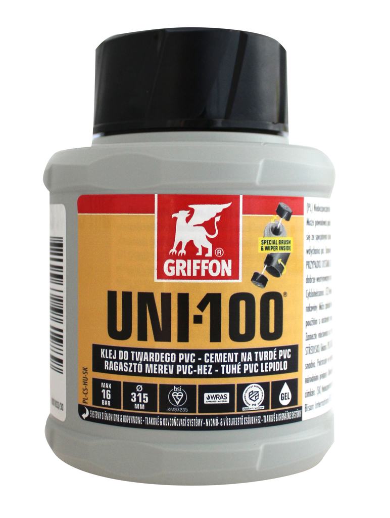 Lepidlo na lepení tahově a tlakově pevných spojů tlakových rour (např. potrubí na pitnou vodu) s fitinky PVC-U, na lepení kabelového kanálového potrubí, střešních okapů z PVC-U apod. Před lepením doporučujeme lepené plochy očistit čističem Griffon. Maximální lepený průměr 315mm. Maximální tlak 16 Bar.