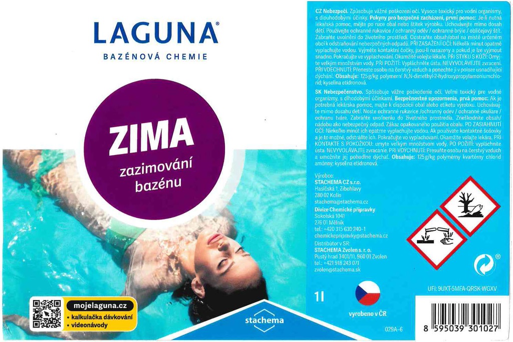Návod k použití: Na konci sezóny připravte bazén na přezimování dle pokynů pro zimní údržbu bazénu výrobce. Nejdříve vypusťte vodu pod skimmer a zpětné trysky, případně světla, odmontujte všechny odpojitelné hadice a příslušenství. Upravte hodnotu pH a chloru a následně použijte přípravek Laguna Zima. Potřebné množství zřeďte 1:10–20 vodou v plastové nádobě a podél okraje vlijte do bazénu. Po zakrytí plachtou a jejím upevnění je bazén připraven na zimu. Sníženou hladinu vody v bazénu je třeba udržovat celé zimní období.